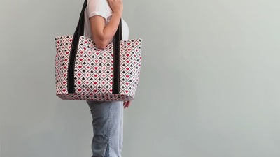Designer tote bags for Women — Designed in North America, this black, white, and red playing card pattern in checker design,will add a relaxed, fun vibe to your day.