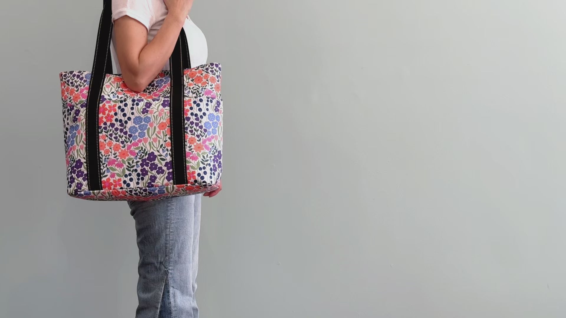 Designer tote bags for Women — Designed in North America, This vibrant botanical floral pattern, featuring lively purples, cheerful peach tones, bright blues, and fresh greens, brings joy and uplifts your day