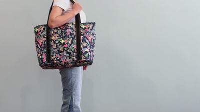 Designer Tote bags for Women — Designed in North America, this vibrant coastal pattern blends navy, pink, ocean blue, and green tones to create a joyful island look that brightens your outfit and shows off your playful personality.